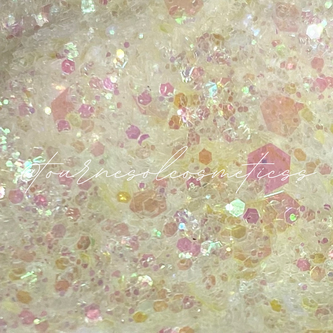 Sparkly white chunky glitter with pink to blue iridescent pieces all throughout