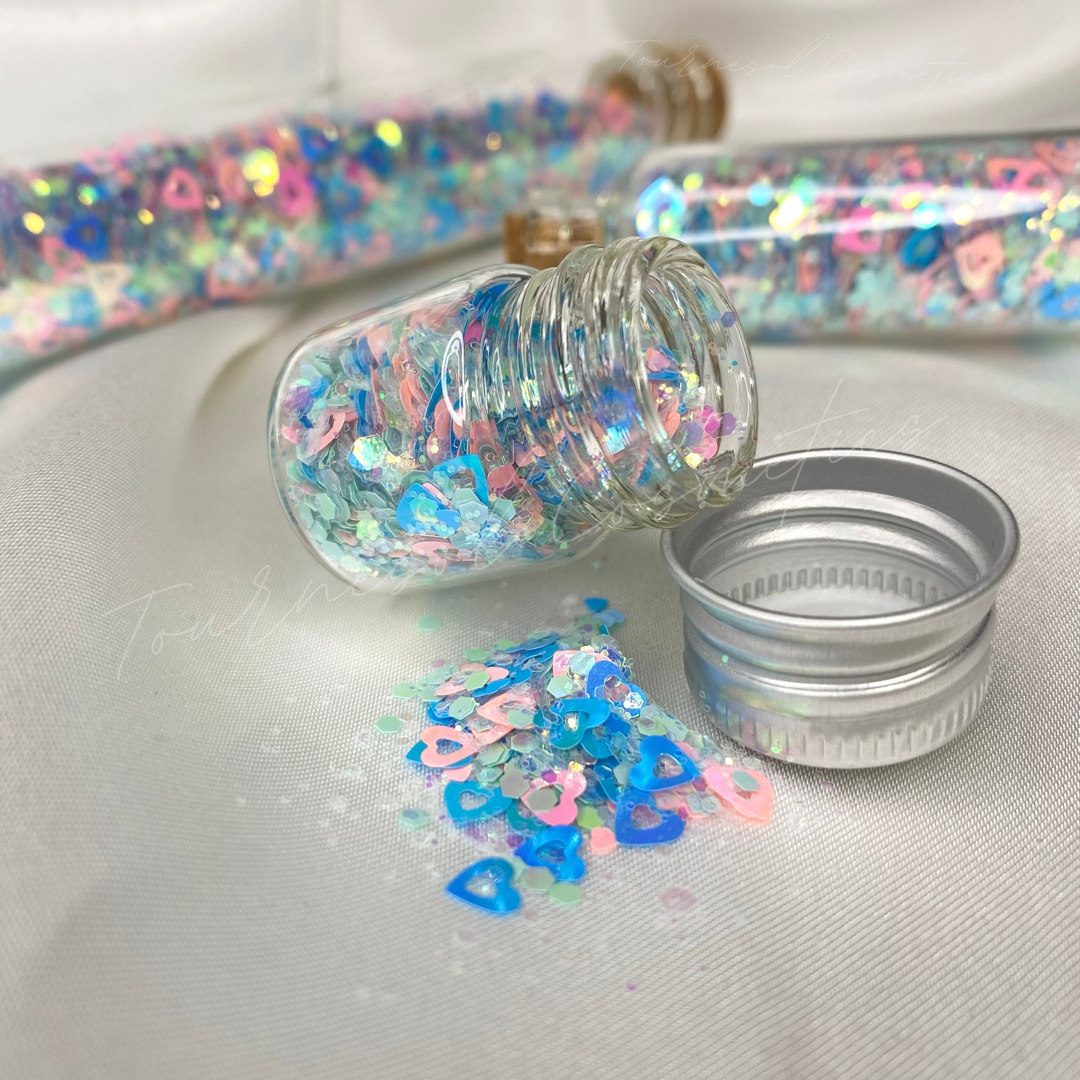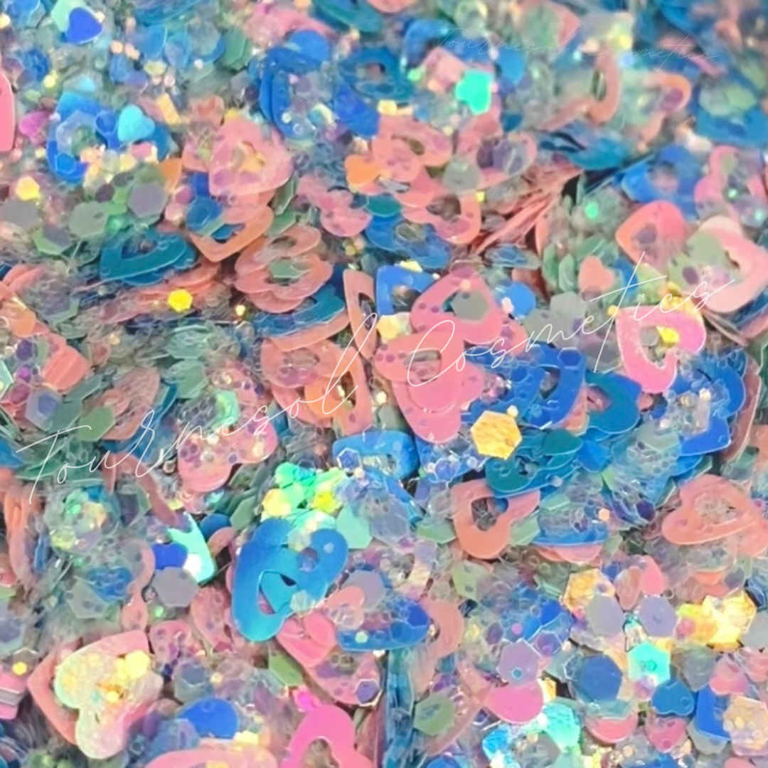 - Tiny iridescent glitter chunks with Bigger Pastel Blue and Pink heart shaped Glitter pieces