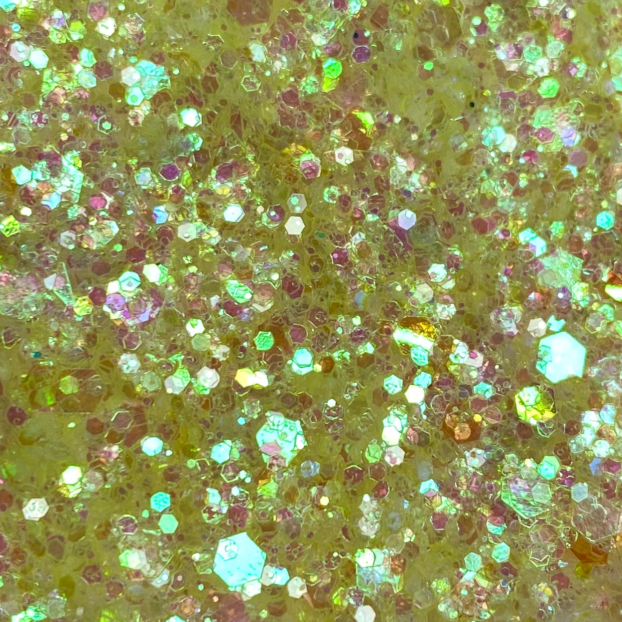 Yellow with Iridescent glitter that shifts from pink to green when hit by light
